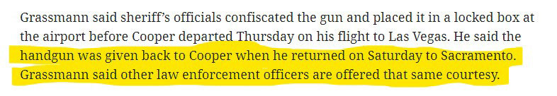 Grassmann said sheriff’s officials confiscated the gun and placed it in a locked box at the airport before Cooper departed Thursday on his flight to Las Vegas. He said the handgun was given back to Cooper when he returned on Saturday to Sacramento. Grassmann said other law enforcement officers are offered that same courtesy.