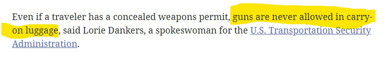 Even if a traveler has a concealed weapons permit, guns are never allowed in carry-on luggage, said Lorie Dankers, a spokeswoman for the U.S. Transportation Security Administration.